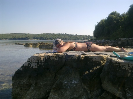 Мы уходили на мыс, напротив острова и грелись, как тюлени на «каменных лежаках». Т воздуха была 30 гр., вода 25. А в это время на юг Италии наступала жара 42 гр. Которая нас застала в последний день- это было слишком.