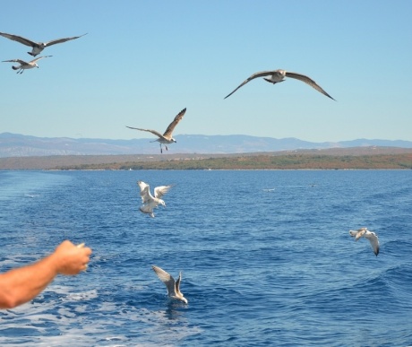 Обед был знатный: на выбор мясное или рыбное (с местной рыбой) блюдо, сделанное на камбузе, большого объема, с овощами, красное и белое вино (и превкусное!) в ассортименте, под музыку из динамиков. Далее наш массовик-затейник начал выхватывать рыбьи головы и остовы прямо с тарелок и с рук кормить чаек. Это, видимо, была тоже часть анимации. Начался чаячий кишмиш: смешались попы, клювы, крылья...