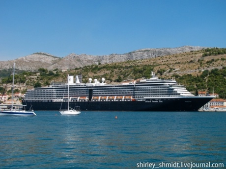 Вдаль уплывает круизный корабль. Вокруг Дубровника много островов. Из них всего несколько обитаемые и приспособленные для туризма.