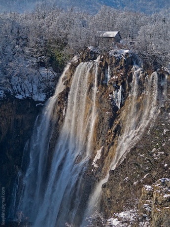 Вообще, сначала все было не так красиво... Плотная и мокрая метель, видимость пару метров... Вот получилось вытянуть из фотографии очертания водопадов сквозь снегопад. В действительности и этого не было видно - сплош ная серая пелена