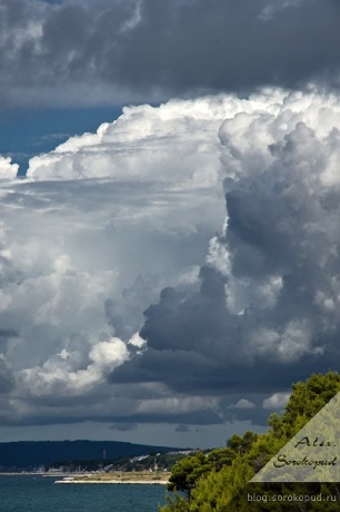На второй день с утра все было затянуто страшненькими тучами, над островами, до которых примерно 15 км, шел сильный дождь. Мы пошли к морю, по дороге немного свернули с тропы и зашли на открытую площадку. С нее открывался вид на Сплит. В районе Сплита и меньшего острова было что-то крайне интересное. Помимо проливного дождя, была видна такая водяная "струя" от туч до земли, похожая чем-то на фотографии смерчей. Она постоянно менялась и имела устрашающий вид. Уже потом в обед мы спросили бармена про эту красотень, он сказал, что эта вещь "not dangerous" и очень часто тут бывает, мол просто такой водяной столб дождя.