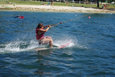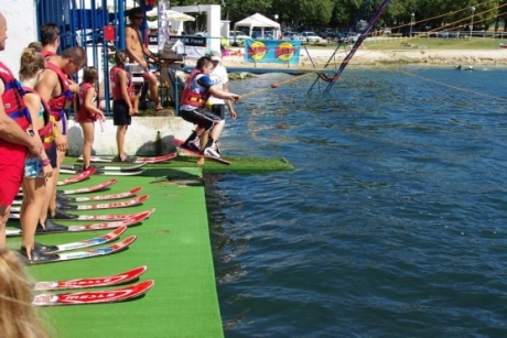 И естественно, увидев лыжи здесь и зная, что старт с суши на порядок легче, чем с воды, у меня загорелись глаза. Но все же помня о предыдущих победах мандража было дофига. Поэтому я сначала пришла на станцию и стала наблюдать — учиться. Наблюдала я минут 40 :) Все вроде казалось очень просто. Я еще стояла и думала брать лыжи или борд. Решила, что раз уж у меня есть опыт катания на горных лыжах, а на борде совсем никакого, то лучше брать лыжи. Пошла в кассу, купила 5 попыток (или 5 кругов — у кого что получится :))), сказала, что 1й раз и вообще нифига не умею и страшно боюсь. Девушка меня успокоила, что со мной проведут инструктаж и все будет ок. Стала в очередь, стала искать инструктора. Им оказался парень, который выдает поводья лыжникам, садит их в нужную посадку и отправляет в плавание :). Когда моя очередь подошла, я стала ему по-русски объяснять, что я не умею и что бы он мне все хорошо объяснил. Он спросил — по-английски понимаешь, говорю- да. Его объяснение свелось к тому, что он усадил меня в нужную посадку и сказал, что нужно будет выпрямиться и стать на лыжи :)))) я бы это и на хорватском поняла, и это я и так знала. Но тут свершилось неожиданное! Я таки стала и поехала!