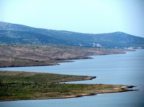 Здесь начинается длинный, плоский и безжизненный остров Паг, тянущийся ещё на 200 км. Его ландшафт оживляют только ветряки:
