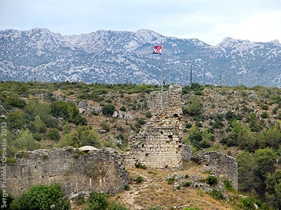 Небольшое селение разбросано по обе стороны бетонированного канала. Выглядит очень даже интересно, но жить здесь весьма непросто. Еще непроще жить в последующих селениях, представляющих собой одинокие домишки на пустынных раскаленных участках. Если прикинуть, что в обе стороны по два часа до цивилизации, а до моря и еще дальше, то как-то совсем невесело. В Перушиче обнаружилась старая крепость с флагом на шпиле. А также остатки древней стены с арочным проемом по центру. (фото стрелял сквозь стекло, поэтому качество оставляет желать лучшего)