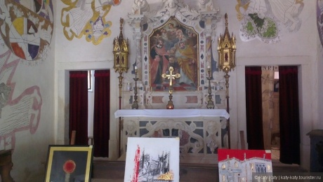 На выходе из городка находится небольшая церквушка, название уже даже и не вспомню. Стены ее расписаны художником из Америки, который здесь устроил выставку своих работ. Таких же необычных и удивительных, как и стены!