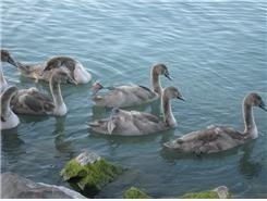 По Балатону плавают лебеди с выводками. Взрослые - пронумерованные (обратите внимание на шею).