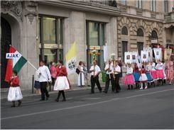 Далее был крестный ход. Люди с разных регионов Венгрии в национальных одеждах организованной колонной проходили по улицам. Люди пели религиозные песни.