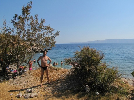 Километров через 60 после Сплита, после Макарска, начинаем искать кемпинг. Заезжаю в один – все занято, в другой – занято. Нашли место в городке Подгора. Кемпинг Sutikla ( http://ru.camping.info/mesta-dlia-kempinga ). Обошелся он нам в 183 куны (25 евро), это другое дело, цена адекватная. Время около 18 часов. Ставим лагерь, идем купаться, благо кемпинг практически на самом берегу моря. Жарко, покупаем на набережной четвертинку большого прохладного арбуза и наслаждаемся поеданием огромной ягоды. Кемпинг тихий, но очень уж плотный. Палатка на палатке.