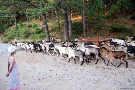 Последняя встреча в этот день, уже внизу, состоялась с козами. Они стояли в лесочке у дороги и смотрели на нас. Мы подъехали к ним ближе и стали смотреть на них. Они подумали немного и вдруг всем своим стадом пошли вверх по дороге, заблокировав всю проезжую часть.