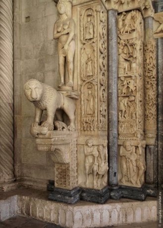 Кафедральный собор Святого Ловро (XIII — XVI века) располагается на площади Trg Ivana Pavla II (площадь Папы Иоанна Павла II) и имеет очень древний фундамент — римский форум. Это один из старейших религиозных памятников Хорватии. В архитектуре храма органично сочетается основательность древней кладки с монументальностью романского стиля и с известной лёгкостью венецианской готики. Его жемчужина — резной портал, созданный мастером Радованом более семисот лет назад. Мы минут тридцать рассматривали колонны, украшенные резными сюжетами на тему быта горожан, аллегориями времен года, знаками Зодиака, библейскими картинками, сценами охоты, битв и спортивных состязаний.