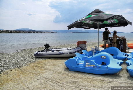 На пляже работают пункты проката спортивного инвентаря. Мы здесь, например, арендовали каяки и плавали на них до ближайшего острова Зларин.